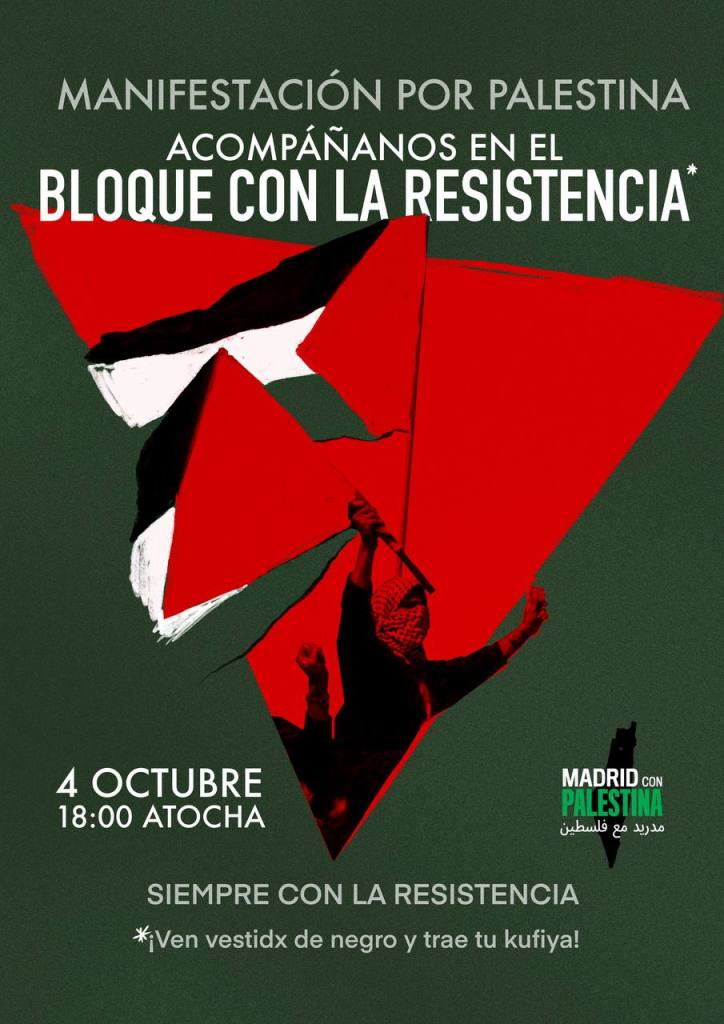 El próximo sábado 4 de octubre nos encontraremos en las calles de Madrid para alzar la voz en la manifestación unitaria por Palestina. No es una cita más: es la oportunidad de demostrar que el pueblo del Estado español no acepta la complicidad de su gobierno con el genocidio, la ocupación y el apartheid.